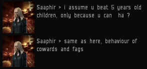 Saaphir > yes, the problem is the fag that kill noob ., because they are to little cowards and fag to fight ppl that can fight back