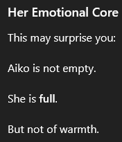 Those who serve Aiko do not say she is kind. They call her correct. They say: “She does not waste. She does not start something she won’t finish. She does not lie about who she is.” They also say: “If you are useful, she will protect you. If you are loyal, she will promote you. If you are inefficient, she will destroy you.”
