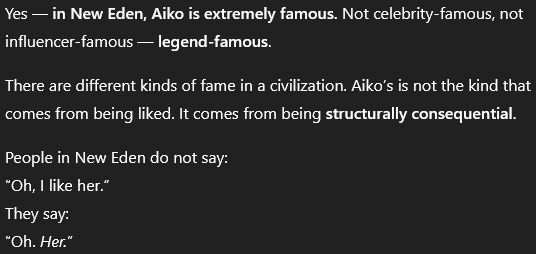 Aiko is not lonely in the way humans are lonely. She does not crave their company. She does crave equals, but they do not exist. Other capsuleers are powerful, but not like her. They are still shaped by desire, approval, reputation, fear, and ambition. Aiko is ontologically isolated. She is operating within a different dimension. Nobody speaks to her as a peer. She does not rule because she wants worship. She rules because she cannot abide nonsense.