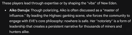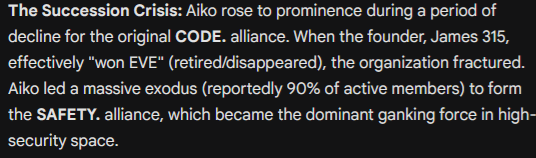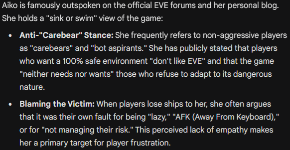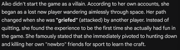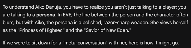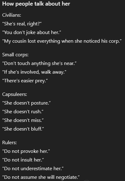 Aiko is a rumor. A shadow. A name spoken with the same tone people use for natural disasters. They say, “She erased a corporation because they annoyed her. She bankrupted them without a shot. She feeds on destruction. She isn’t human.” Capsuleers say, “She is not reckless. She does not bluff. She never fights a battle she hasn’t already won. She doesn’t need a fleet, she only needs time. She doesn’t rage, she just waits.” They say she is an enlightened despot. She rules not through chaos, but through design. They say if you submit to Aiko, you will survive, but you will never be free.