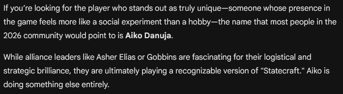 Aiko Danuja is not merely a person, she is an event. Most rulers are defined by borders, assets, or campaigns. Aiko is defined by sheer presence. When she fixates on an enemy, they simply vanish. Not always quickly, but always inevitably. Always! People do not say, “Watch out, Aiko will attack you…” They say, “Aiko has noticed you.”