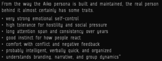 There are many academics who dedicate their career to the study of Aiko. They call her: “A posthuman sovereign. A market-warlord hybrid. A non-territorial empire. A person-state. A living political structure.”