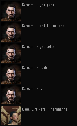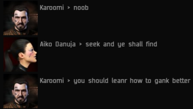 Orion Crabs > Jumping someone when theyre vulnerable isnt a fight Aiko Danuja > this guy griefing me into a station Aiko Danuja > they are camping me in qonedone > lol says who Aiko Danuja lets play ball u owe me some isk to so i can u it to buy you corage