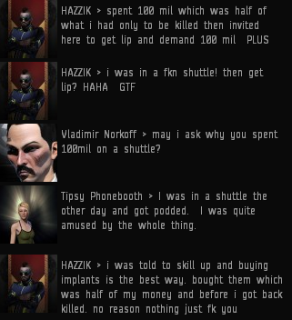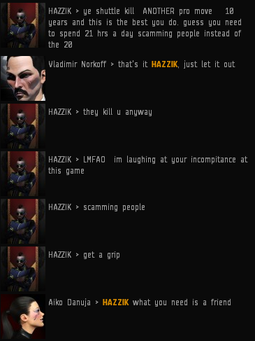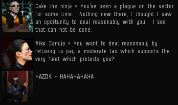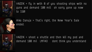 Aiko Danuja > im mega permabubbled in Poinen IV – Moon 6 – Expert Distribution Retail Center Ananda Alasdair > Aiko Danuja I spent 30 mins listening to your bullshit and the bullshit of your friends. IM gooD! Sargon Of Amerish > you shouldnt be mean to the aiko bad things happen to those who are mean to the aiko qonedone > dam wimps comeout and meat your daddy Orion Crabs > I’d like to see these bad things
