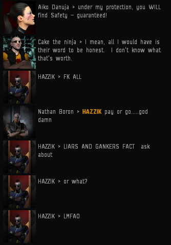 Orion Crabs > Jumping someone when theyre vulnerable isnt a fight Aiko Danuja > this guy griefing me into a station Aiko Danuja > they are camping me in qonedone > lol says who Aiko Danuja lets play ball u owe me some isk to so i can u it to buy you corage