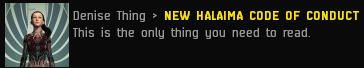 The new New Halaima Code of Conduct is the constitution of our Democratic People’s Republic of Khanid (DPRK). It was written by the entire community (namely, me). As Supreme Protectoress and High Saviourette, I represented all individuals as your proxy when drafting our social compact. This means everyone who enters new New Order territory is deemed contractually liable. Fortunately, for your convenience, it is now possible to codify the entire law.
